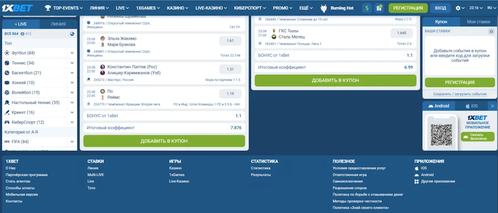 Пользователи 1xbet могут не только заключать пари на спортивные события, но играть в онлайн казино, тотализатор и множество других азартных развлечений!