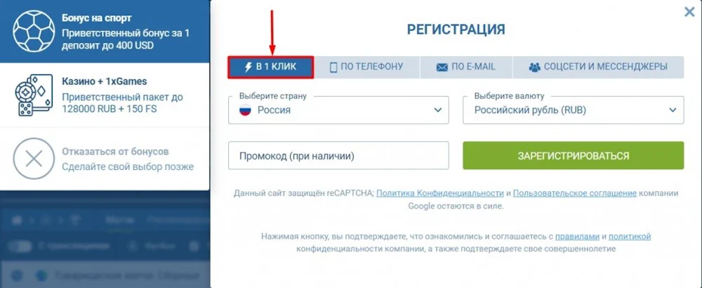 Создать аккаунт в букмекерской конторе 1xbet можно буквально в несколько кликов. Для этого сначала требуется кликнуть на кнопку 1xbet регистрация. Откроется небольшое окно, в котором пользователю требуется выбрать способ регистрации. Всего их четыре – в один клик, при помощи мобильного телефона, адреса электронной почты или социальных сетей.
